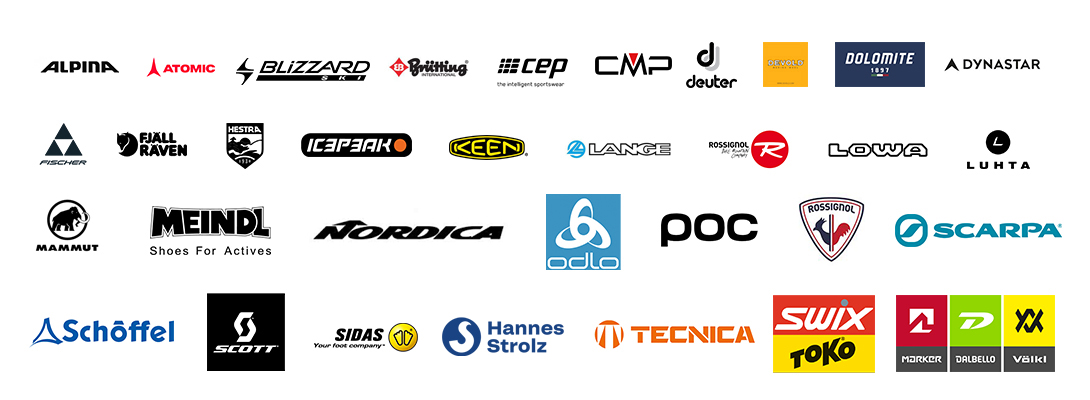 Alpina, Atomic, Blizzard, Brütting, CEP, Deuter, Dolomite, Dynastar, Fischer, Fjall Raven, Icepak, Keen, Lange, Rossignol, Lowa, Luhta, Mammut, Meindl, Nordica, Odlo, Poc, Scarpa, Schöffel, Strolz, Scott, Sidas, Tecnica, Swix Toko, Völk